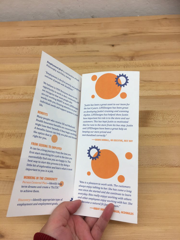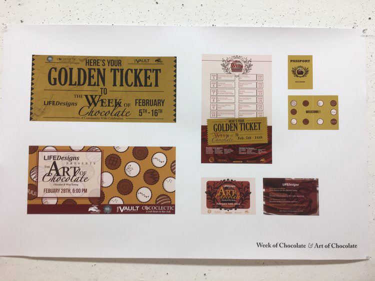 I collaborated with a design team in creating these first versions of marketing collaterals for LifeDesigns, a non-profit organization who aids their customers, both seniors and people with disabilities, and they believe in ability and independence. We made these items with a thought in mind that they needed to both visually appealing and suited their needs - we redesigned their brochures, "Employment first" campaign, their halloween postcard, and "The Art of chocolate" events - billboards, invitation, poster, brochure, and passport.